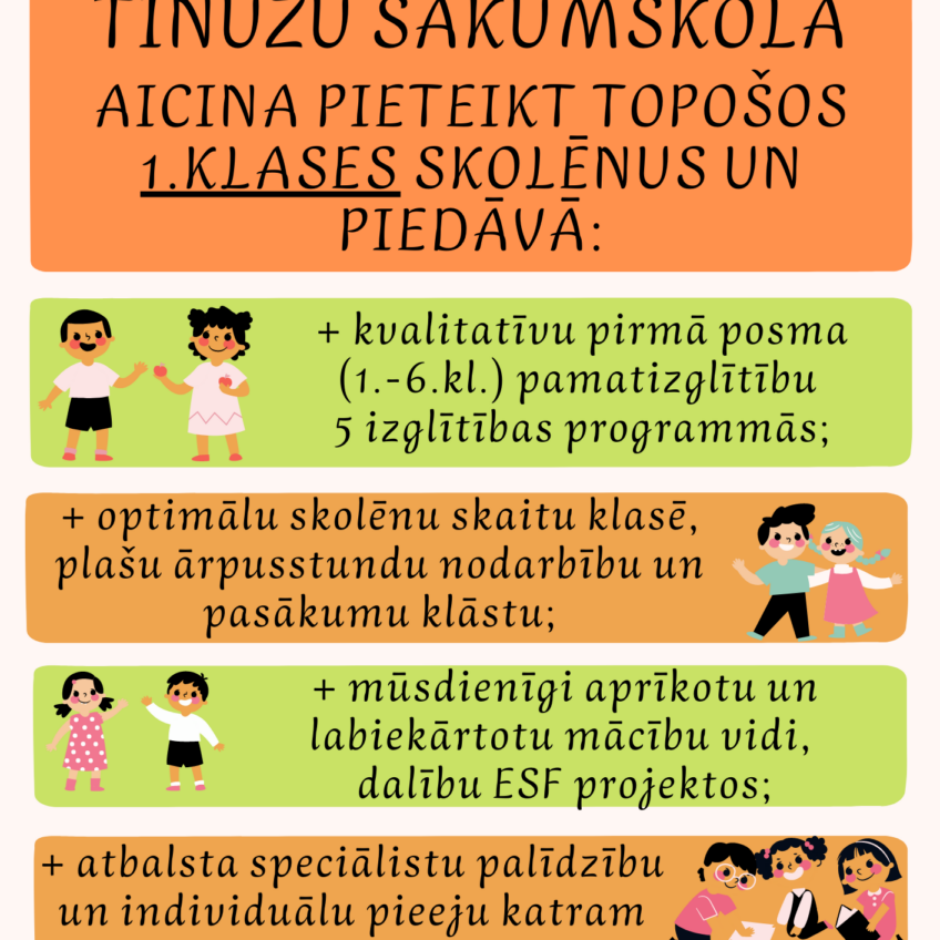 Ar 2024. gada 1. februāri Tīnūžu sākumskola aicina pieteikt topošos 1. klases skolēnus jaunajam – 2024./2025. mācību gadam.