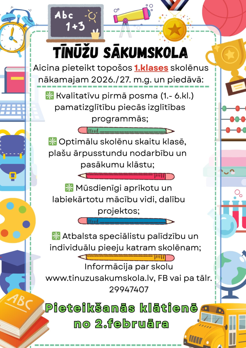 Aicinam pieteikt topošos 1.klases skolēnus nākamajam 2026./27. m.g.